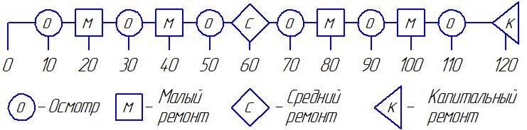 За период межремонтного цикла станок должен быть подвергнут шести осмотрам, четырем малым ремонтам и одному среднему в сроки, указанные в рекомендуемом графике плановых ремонтных работ.